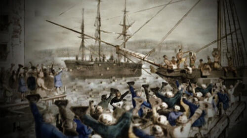 The Boston Tea Party was a political protest staged on December 16, 1773 at Griffin’s Wharf in Boston, Massachusetts. American colonists, frustrated at Britain for imposing “taxation without representation,” dumped 342 chests of British tea into the harbor. The event was the first major act of defiance to British rule over the colonists.